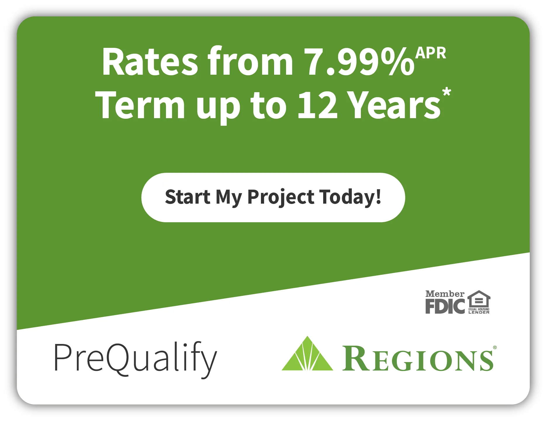 Financing is available through Regions Bank (Member FDIC) on approved credit. Fixed APR ranges from 8.99% to 24.49% (lower limits apply in some states) and is subject to change. Minimum loan amounts apply. Interest begins once funds are disbursed, with repayment terms from 12 to 144 months. The first payment is due 30 days after funding. Monthly payments range from $11.37–$29.03 per $1,000 borrowed, with a minimum monthly payment of $50.00.